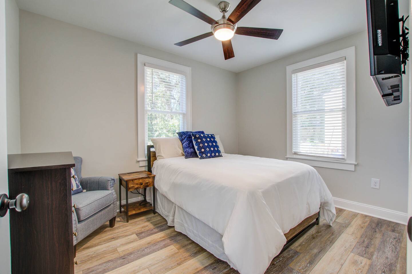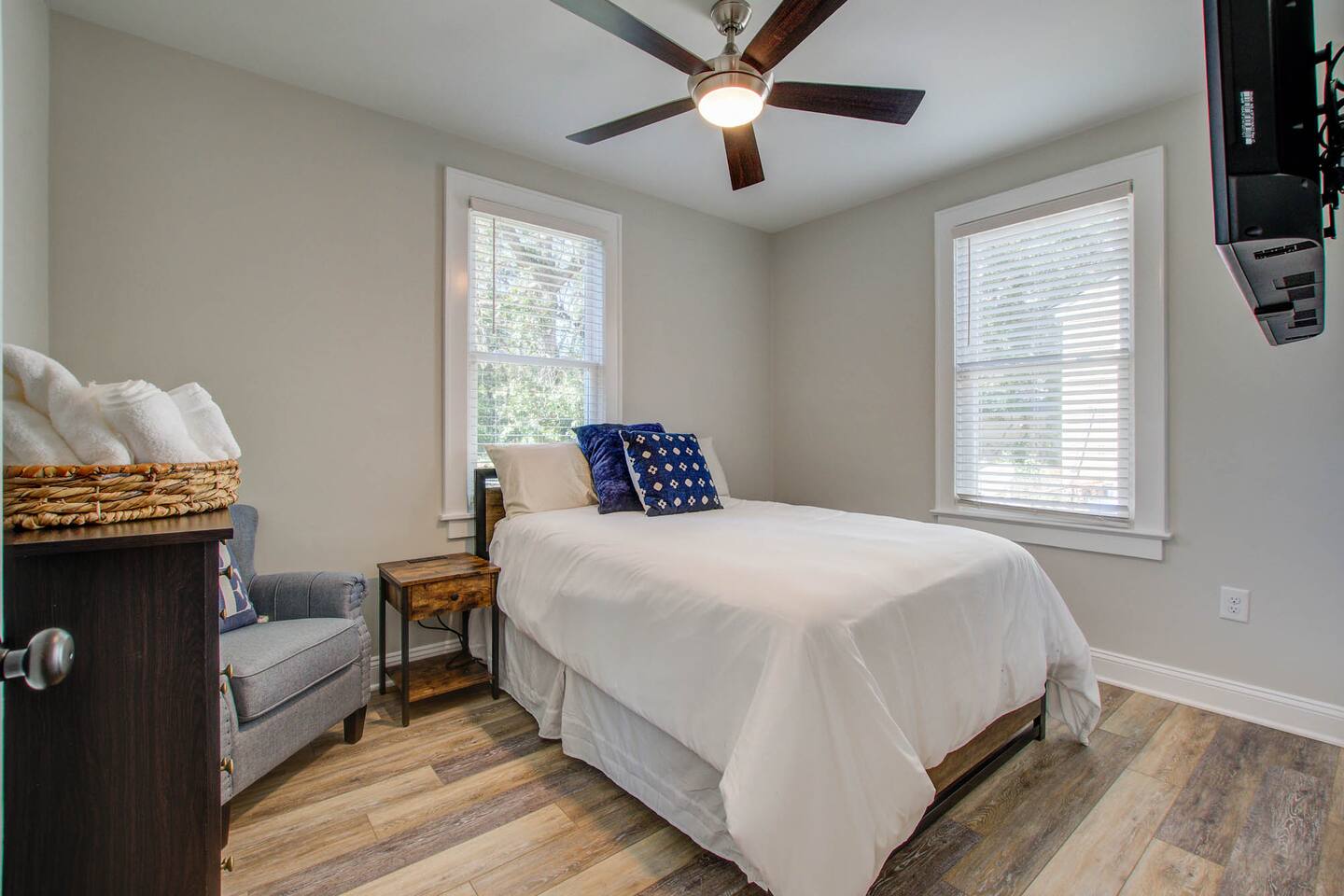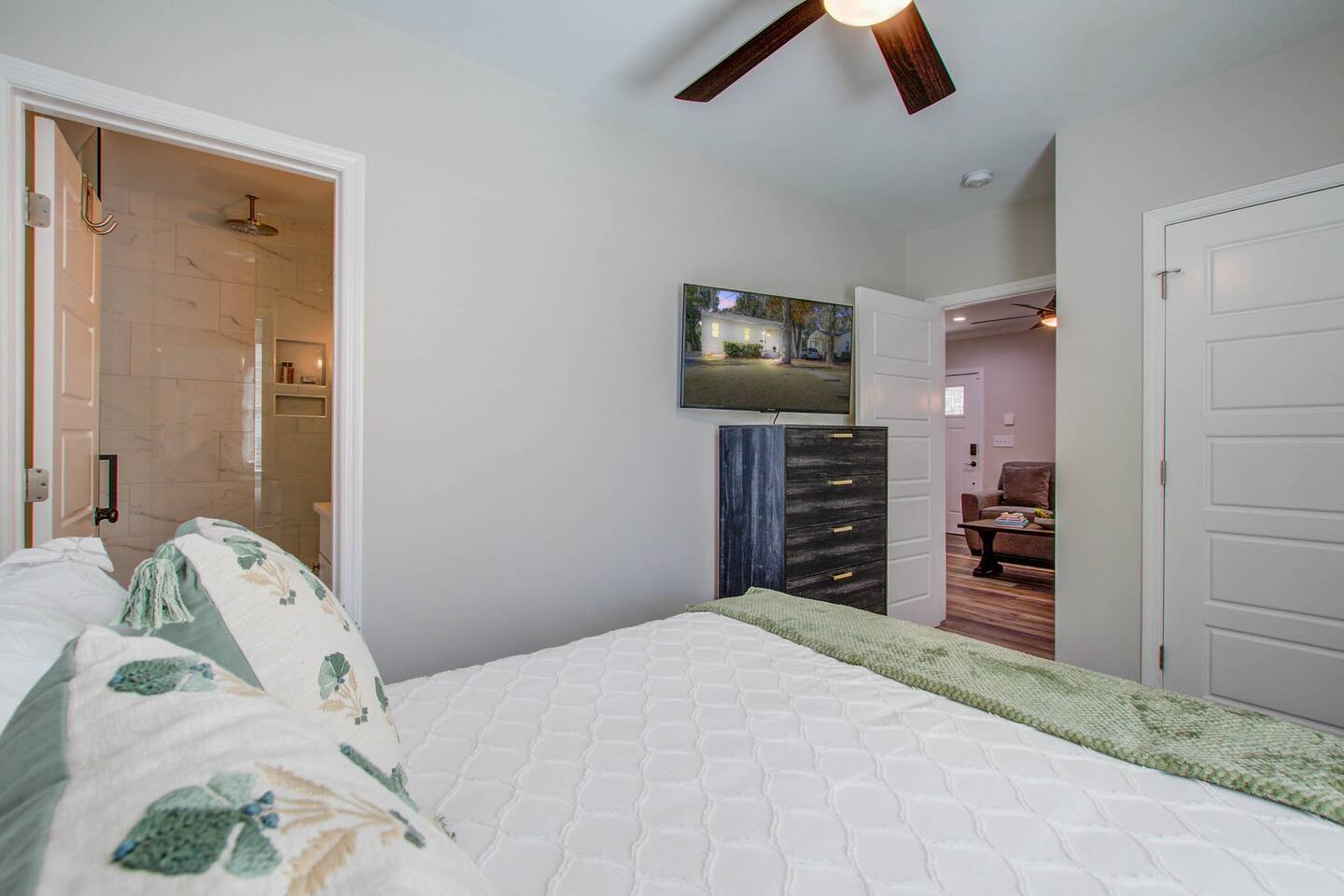 Master Bedroom Queen bed 40” Smart tv Dual Head walk-in shower High thread count bed sheets Full length mirror Iron and Ironing board Spacious closet Blue Room Full size bed 40” Smart tv Full length mirror Closet Gray Room Queen size bed 40” Smart tv High thread count bed sheets Spacious closet